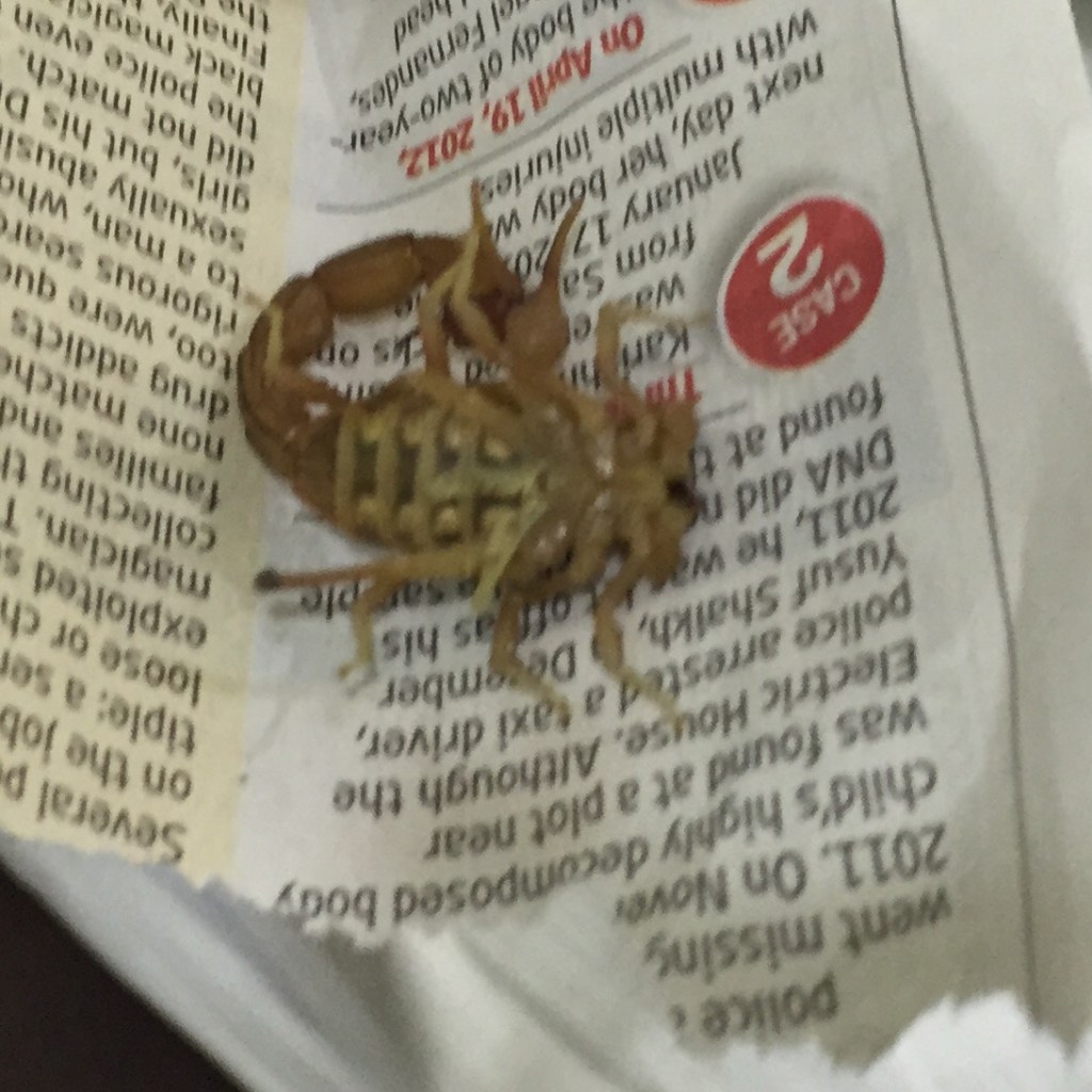 Tuesday night, after Mumbai won their IPL match, mom was the first one to go to her room in the Suite. She was reading a book on her bed when I noticed a rather big creepy crawly a few inches from her. What creepy crawly?A scorpion. I told her and dad to get out of the bed ( they didn’t believe me initially). Then I sprayed it with Axe because I read it somewhere. It stung itself. It scrambled around on the bed, and then Dad landed a good Woodland shoe on it. All this happened in a minute. We called house keeping. They got rid of it after I got this picture. ( Viewer discretion is advised)